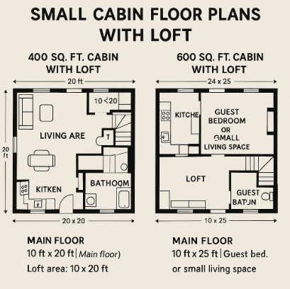 Here are two examples of small cabin floor plans with lofts, showcasing how space can be utilized effectively: