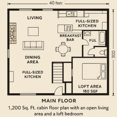 - Dimensions: 20 ft x 40 ft (Main floor); Loft area: 12 ft x 20 ft