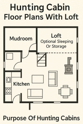 Hunting Cabin Floor Plans With Loft Hunting cabins are designed to serve as practical and simple shelters in remote locations. They provide a basic, no-frills space where hunters can rest and store their equipment while out in nature. These cabins typically focus on functionality rather than luxury, with the primary goal of offering shelter, warmth, and safety during hunting trips. Most hunting cabins are situated in areas far from urban amenities, allowing hunters to enjoy a secluded environment close to wildlife. The simplicity of the amenities makes them easy to maintain and efficient to use for short stays.