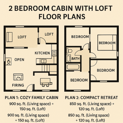 2 Bedroom Cabin With Loft Floor Plans A 2-bedroom cabin with a loft is ideal for small families, two couples, or groups of friends who enjoy vacationing together. The combination of a spacious living area and a loft makes it an excellent choice for those seeking both comfort and functionality. The loft offers additional space that can be used for various purposes, while the main bedrooms provide privacy and comfort for the residents.