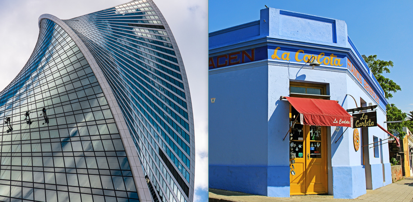 Three window cleaners at the Evolution Tower in Moscow; a blue-painted corner store called La Carlota in Uruguay