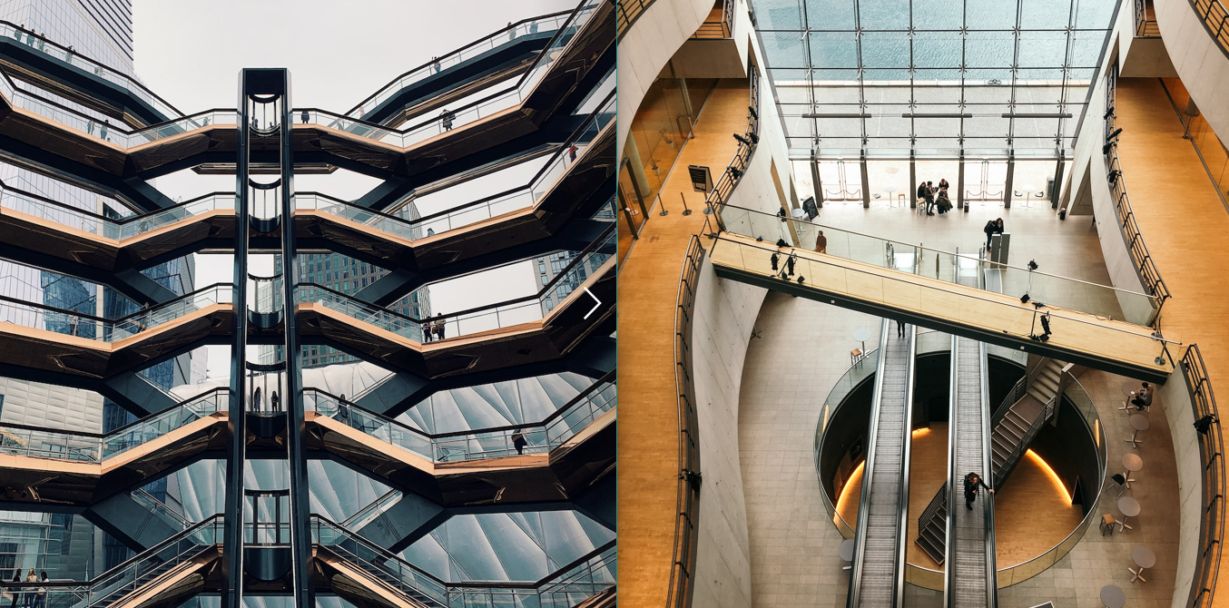 Geometrical bridges at Hudson Yards in New York; top view of a floor opening at Black Diamond in Denmark