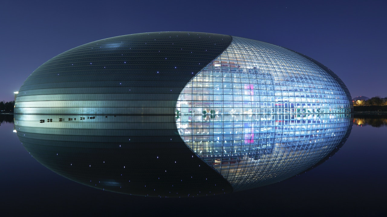 The illuminated National Center for the Performing Arts at night in Beijing, with its reflection on the water