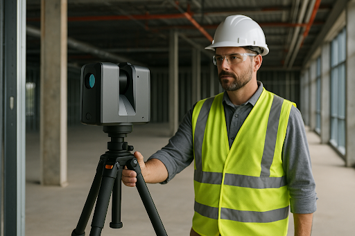 A 3D laser scanner emits millions of laser points per second, recording the exact position of each point in space. As the scanner rotates, it captures every surface — floors, walls, ceilings, MEP systems — with remarkable detail. The result is a point cloud containing millions or even billions of data points that represent the site’s exact geometry.