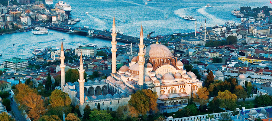 Aerial view of domed mosque with minarets by water Britannica places the Süleymaniye Mosque as one of the greatest works of Sinan, built for Sultan Süleyman I and emblematic of the Ottoman high style.