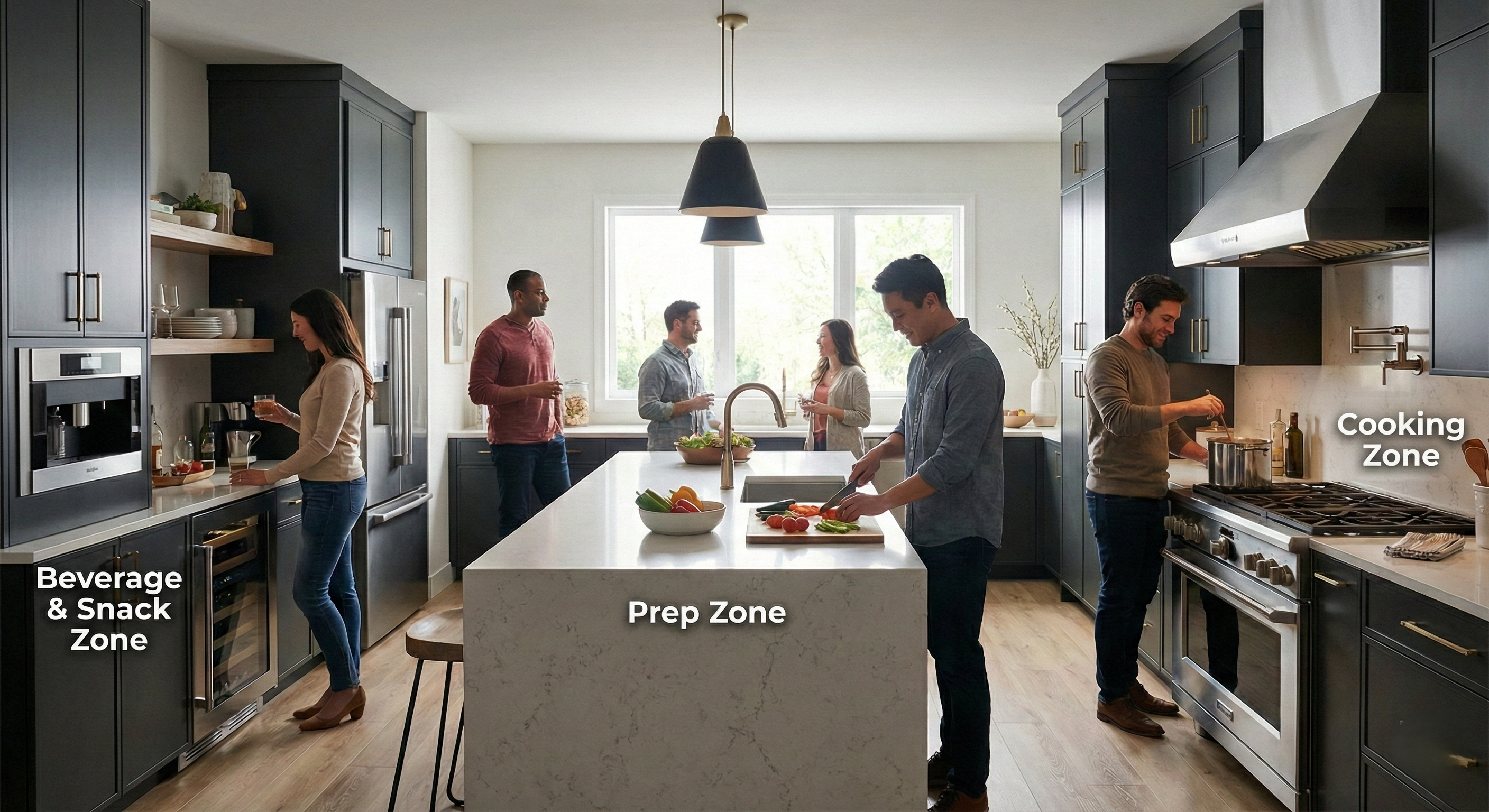 Modern kitchen with labeled prep, cooking, and snack zones Architecture must evolve as behavior evolves. The living kitchen of the 2020s is no longer a hidden room for a solo laborer; it is a social hub, a homework station, and a multi-chef laboratory.