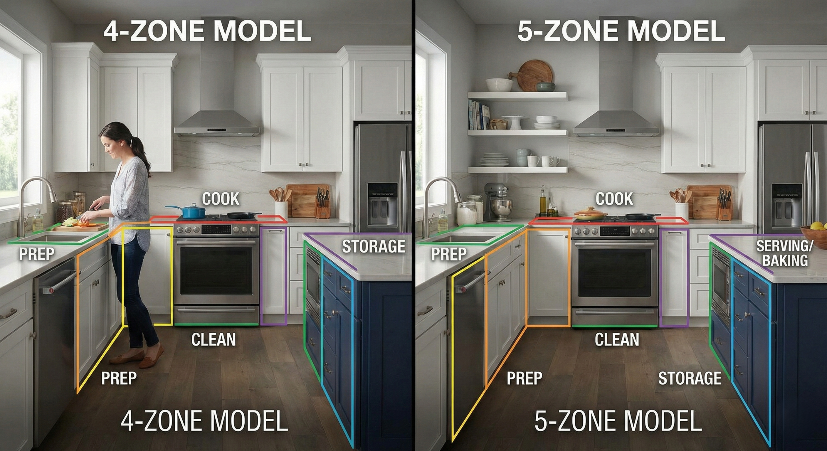Comparing four-zone and five-zone kitchens A 5-zone model often splits storage into consumables (pantry/fridge) and non-consumables (cookware, dishes, small appliances). That can help when storage is spread across a large footprint.