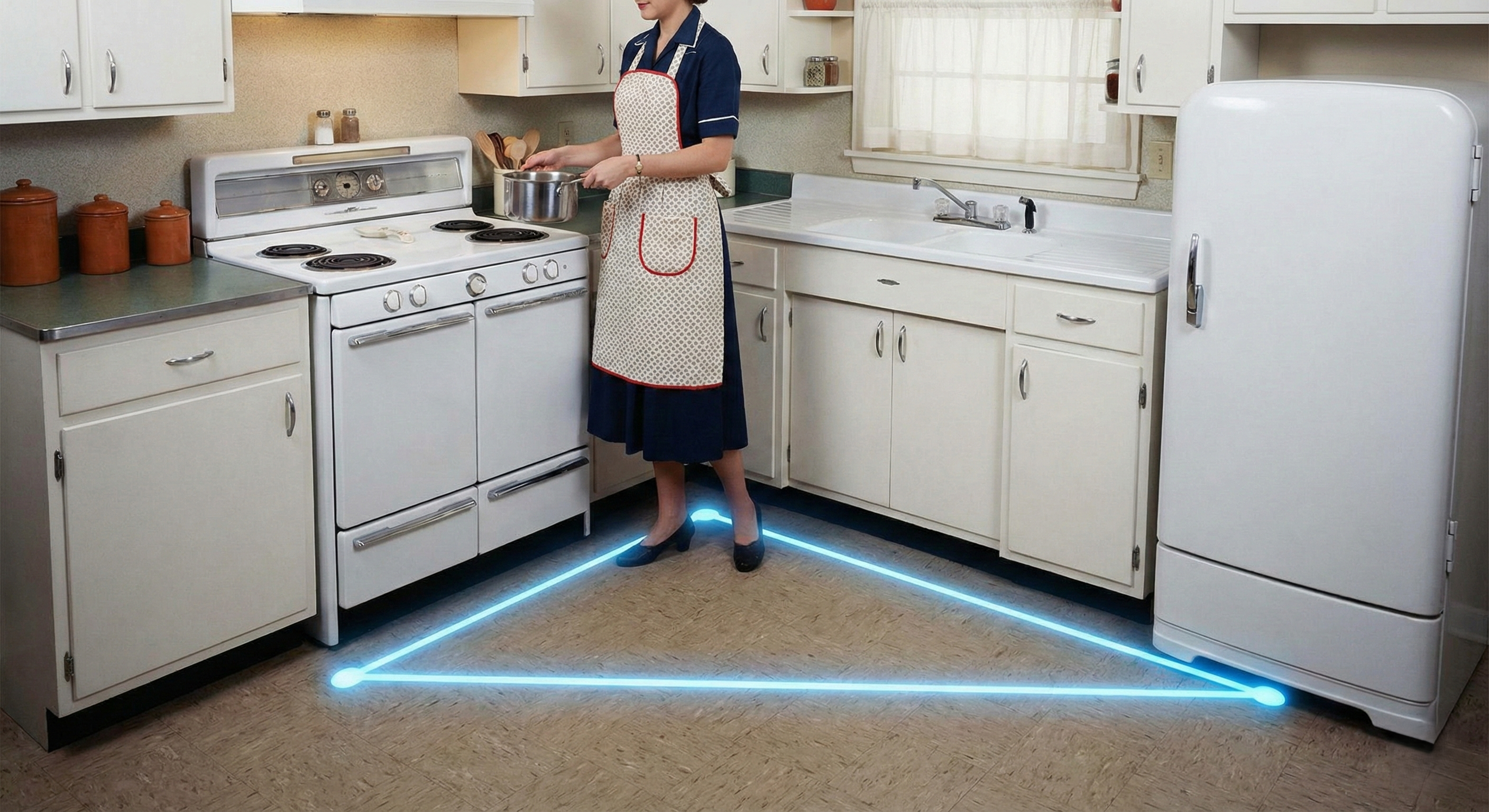 Vintage kitchen with glowing work-triangle around cook The kitchen work triangle was born in the 1940s at the University of Illinois School of Architecture.