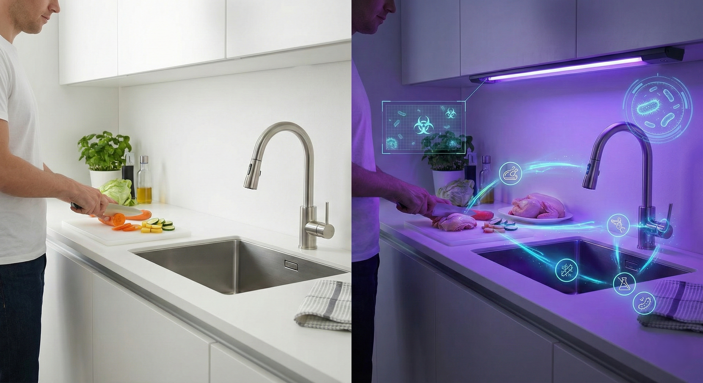 Kitchen prep vs UV sanitation workflow overlay Most kitchen layout conversations talk about efficiency. Fewer people talk about hygiene even though it’s part of how kitchens are used, especially around the sink and prep area. This isn’t about fear; it’s about acknowledging that workflow influences habits.