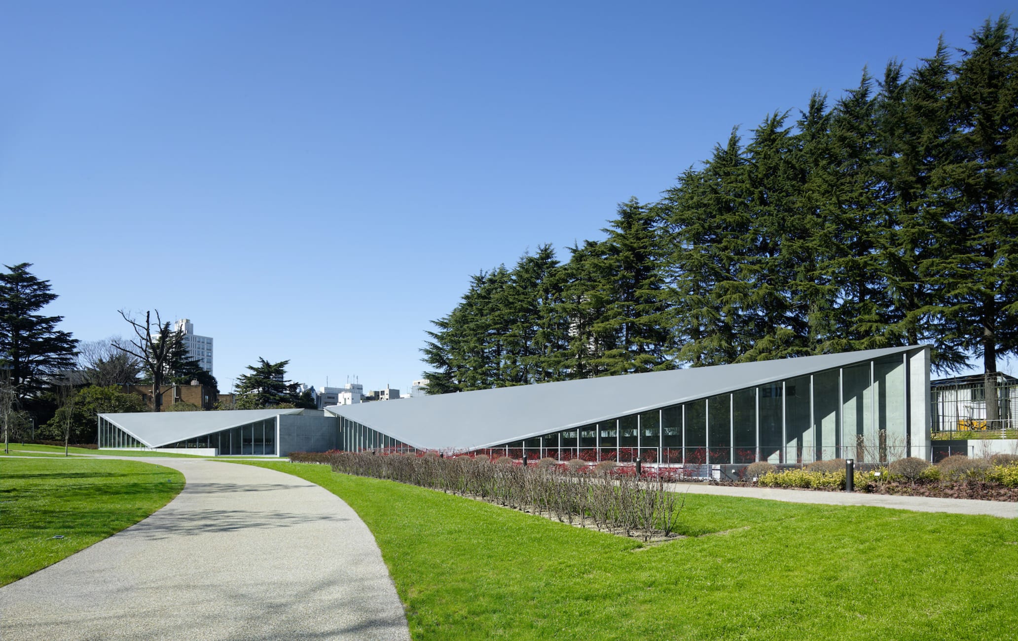 Low modern pavilion with sloped roof in park Established/opened in 2007 in Roppongi, Tokyo, 21_21 is often summarized by its roof: two large steel planes that look like they float just above the ground.