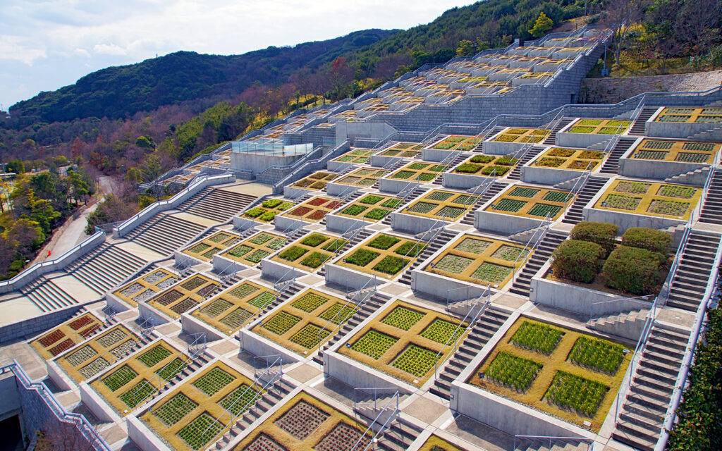 Terraced concrete hillside garden with geometric planted beds A large complex in Awaji, Hyōgo, Awaji Yumebutai is deeply tied to the 1995 Great Hanshin-Awaji Earthquake context, planned earlier, but later read as a project of recovery and ecological repair.