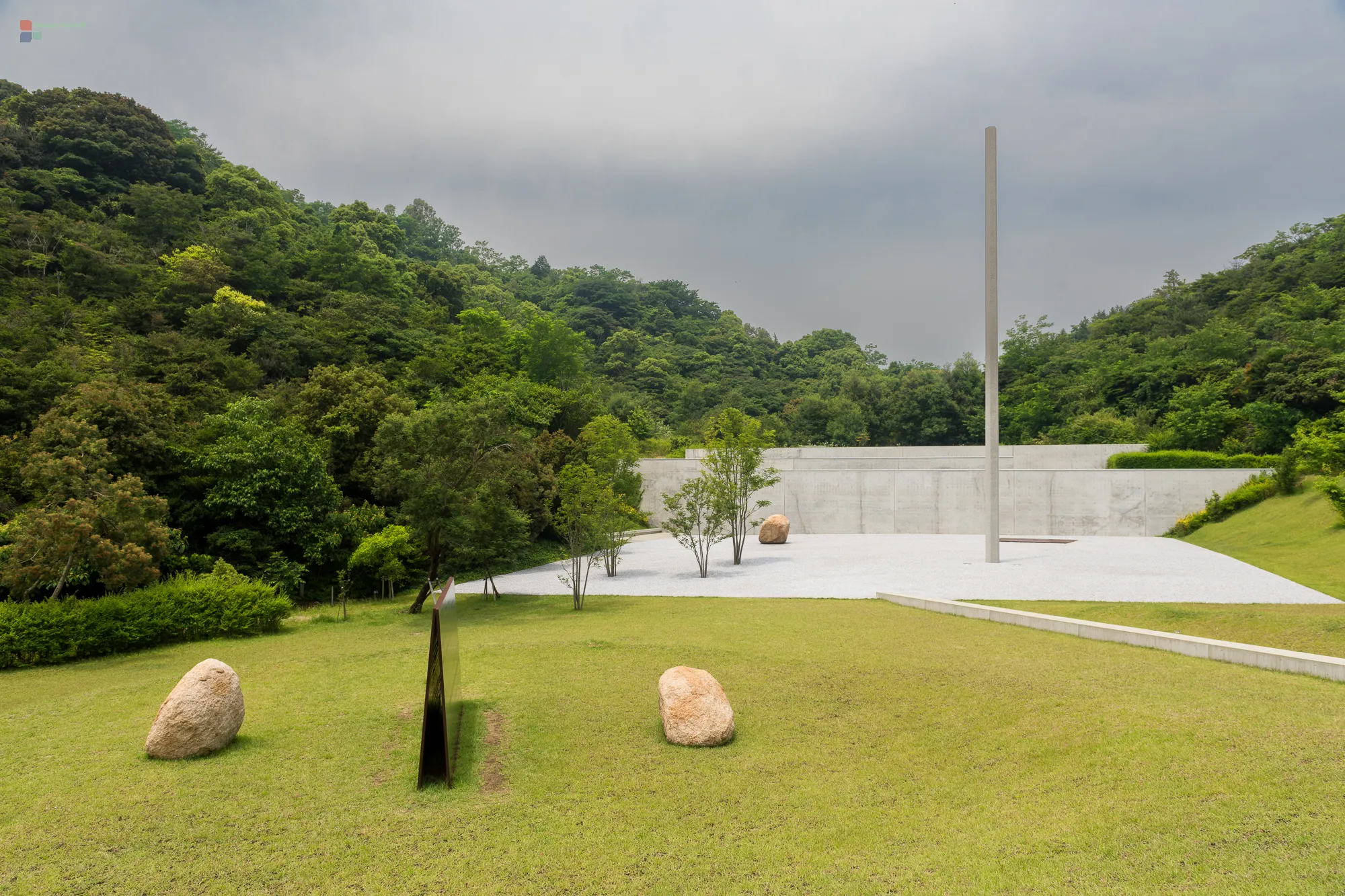 Minimalist outdoor art space with concrete wall and pillar Opened in 2010 on Naoshima, the Lee Ufan Museum is Ando at his most restrained, with long approaches, controlled light, and spatial pauses that match the philosophical quiet of the artworks.