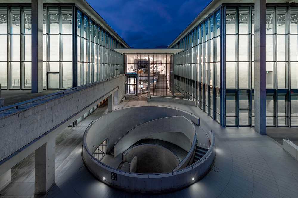 Glass-walled museum atrium with concrete spiral ramp at dusk Opened in April 2002 in HAT Kobe, this museum is explicitly framed as part of cultural restoration after the 1995 earthquake.