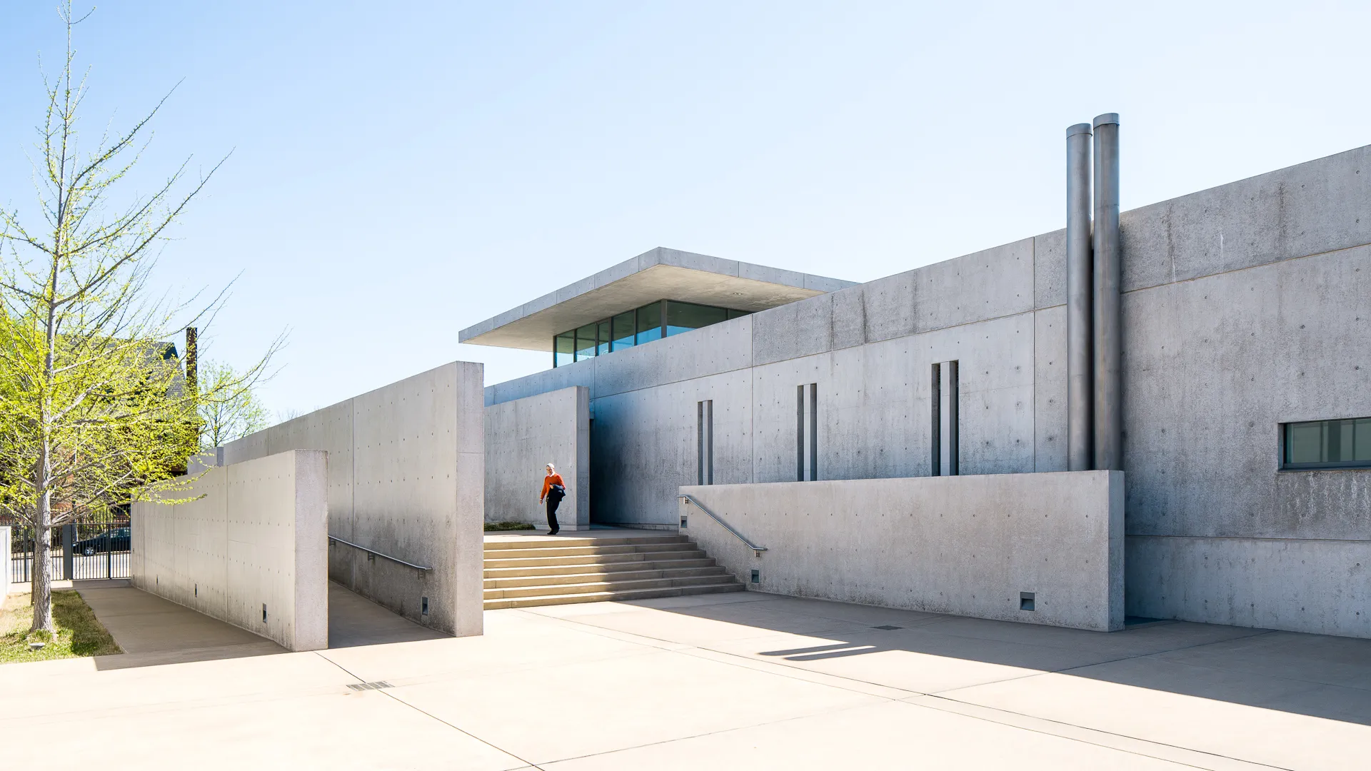 Minimalist concrete building with steps and lone visitor The Pulitzer’s main building opened in 2001 as Ando’s first public commission in the United States, a landmark moment that translated his concrete-and-light language into an American museum context.