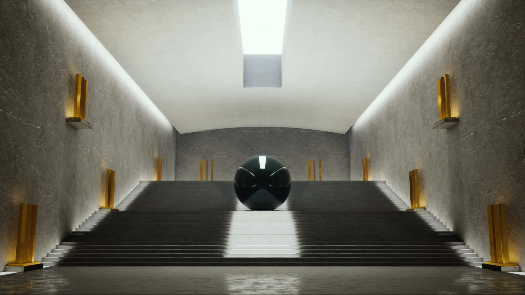 Concrete stair hall with skylight and black sphere Opened in 2004 on Naoshima, Chichu is a museum “in the earth,” where architecture is less about façade and more about choreographing daylight for art.