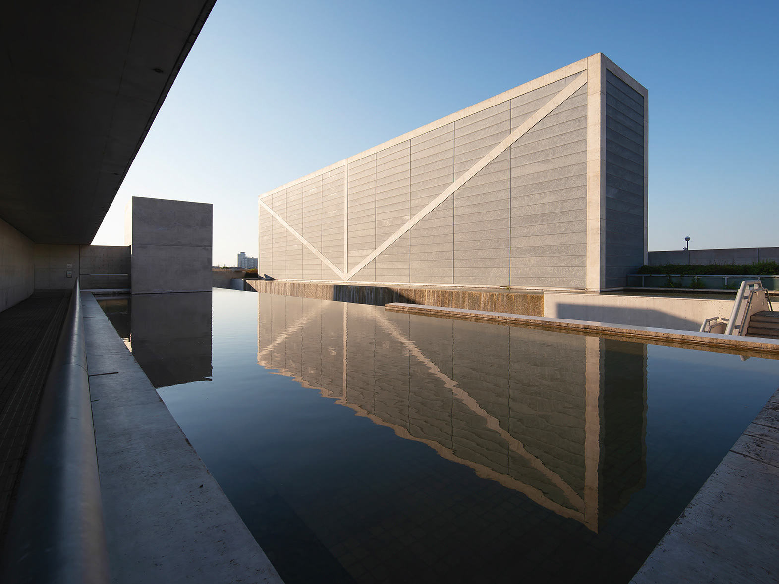 Modern concrete museum beside reflecting pool at sunset In Osaka Prefecture (opened in the early 2000s), this museum is built around an infrastructural story: Sayamaike is tied to one of Japan’s oldest irrigation reservoirs, and Ando turns that history into a spatial experience.