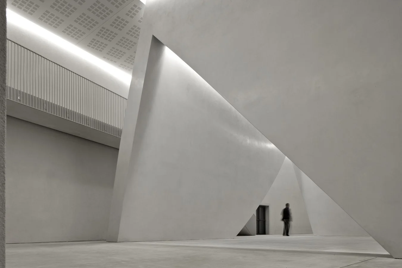 Minimalist interior with angular white walls and lone figure Reopened as a contemporary art venue in 2006 after Ando’s renovation, Palazzo Grassi shows his adaptive-reuse discipline: he holds historic weight and contemporary clarity in the same frame, so the building supports art without shouting over it.