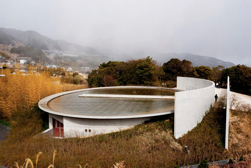 Concrete museum complex with ramps against misty hills Located in Osaka Prefecture and opened in the mid-1990s, this museum is often described through its landform quality: it feels like a geometric intervention in the landscape rather than a stand-alone object.